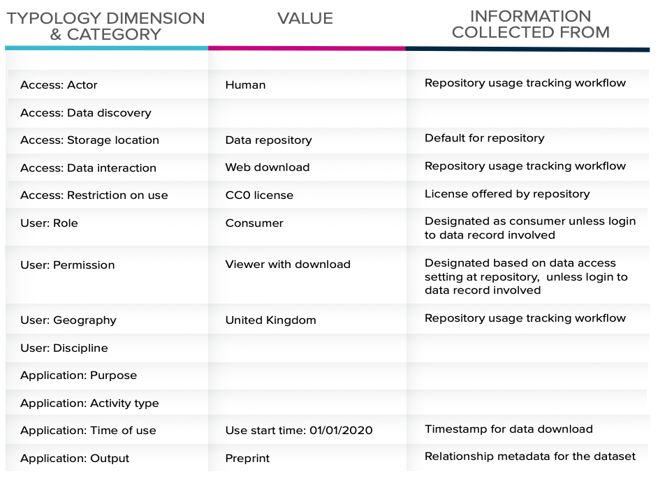 As an example of how the typology can be applied, let’s take a repository manager who seeks to understand how researchers interact with datasets at the repository, so that they can inform service improvements and maximize the utility of their data. The repository manager could map the information the repository collects via metadata and usage workflows to the typology to get structured insights into the use of the data: